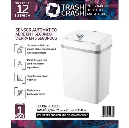 HOGGAN BASURERO PLASTICO RECTANGULAR C/SENSOR 12LTS C/TAPA BLANCA TC-0012L-09-PLS-BL
